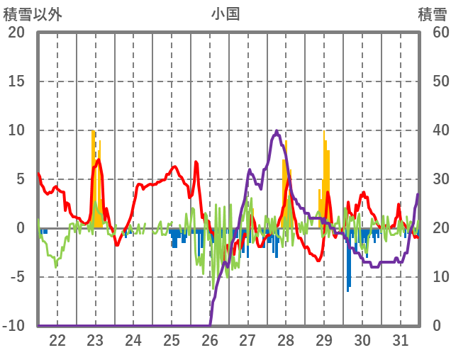 | 日 | 時 | 気温 | 降水 | 風向/風速 | 日照 | 積雪 | 降雪 |
