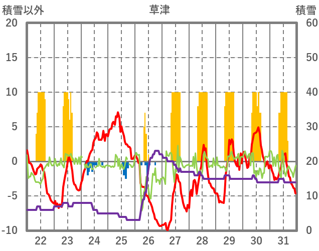 | 日 | 時 | 気温 | 降水 | 風向/風速 | 日照 | 積雪 | 降雪 |