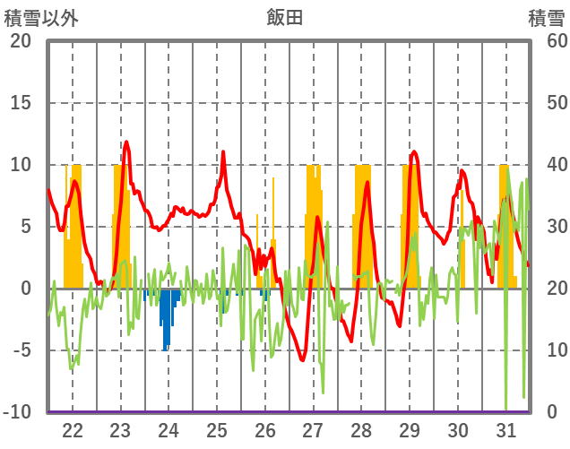 | 日 | 時 | 気温 | 降水 | 風向/風速 | 日照 | 積雪 | 降雪 |