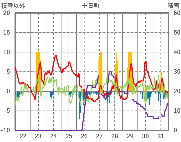 | 日 | 時 | 気温 | 降水 | 風向/風速 | 日照 | 積雪 | 降雪 |