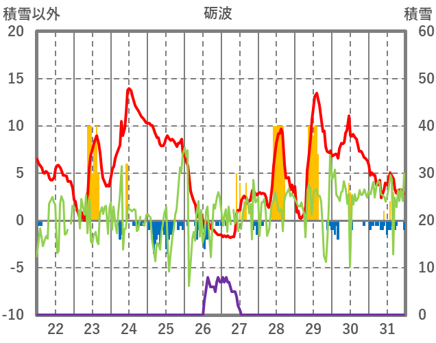 | 日 | 時 | 気温 | 降水 | 風向/風速 | 日照 | 積雪 | 降雪 |