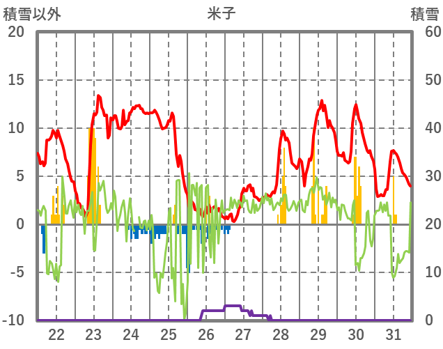 | 日 | 時 | 気温 | 降水 | 風向/風速 | 日照 | 積雪 | 降雪 |