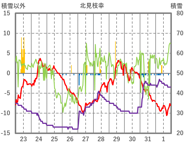 | 日 | 時 | 気温 | 降水 | 風向/風速 | 日照 | 積雪 | 降雪 |