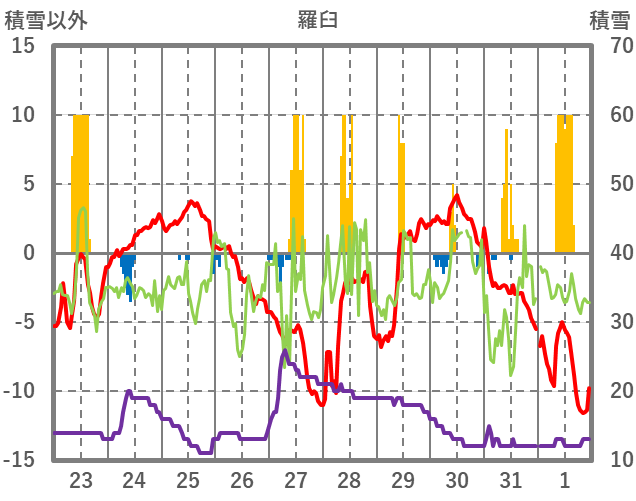 | 日 | 時 | 気温 | 降水 | 風向/風速 | 日照 | 積雪 | 降雪 |
