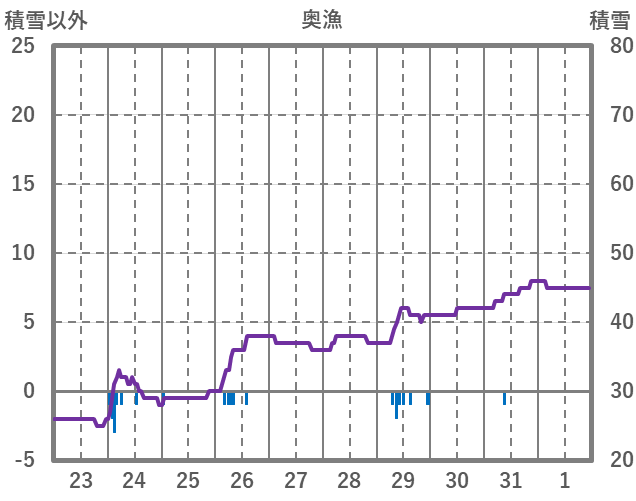 | 日 | 時 | 気温 | 降水 | 風向/風速 | 日照 | 積雪 | 降雪 |