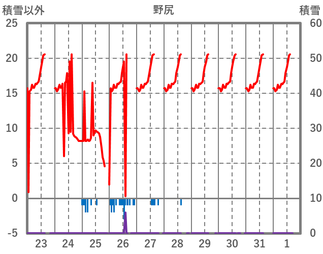 | 日 | 時 | 気温 | 降水 | 風向/風速 | 日照 | 積雪 | 降雪 |