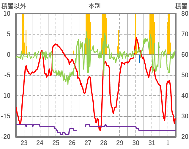 | 日 | 時 | 気温 | 降水 | 風向/風速 | 日照 | 積雪 | 降雪 |
