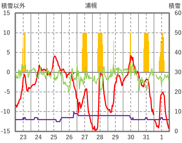 | 日 | 時 | 気温 | 降水 | 風向/風速 | 日照 | 積雪 | 降雪 |