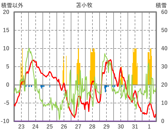 | 日 | 時 | 気温 | 降水 | 風向/風速 | 日照 | 積雪 | 降雪 |