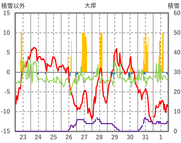 | 日 | 時 | 気温 | 降水 | 風向/風速 | 日照 | 積雪 | 降雪 |