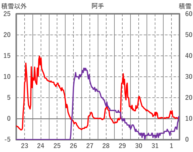 | 日 | 時 | 気温 | 降水 | 風向/風速 | 日照 | 積雪 | 降雪 |