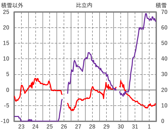 | 日 | 時 | 気温 | 降水 | 風向/風速 | 日照 | 積雪 | 降雪 |