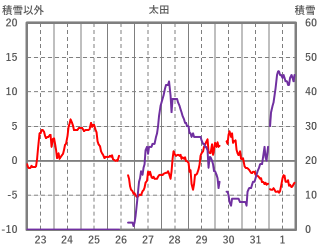 | 日 | 時 | 気温 | 降水 | 風向/風速 | 日照 | 積雪 | 降雪 |