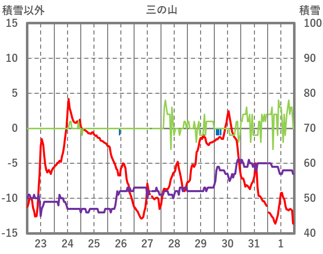 | 日 | 時 | 気温 | 降水 | 風向/風速 | 日照 | 積雪 | 降雪 |