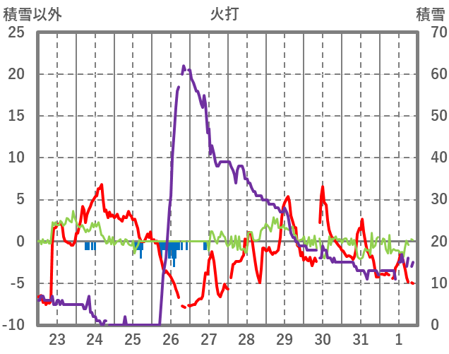 | 日 | 時 | 気温 | 降水 | 風向/風速 | 日照 | 積雪 | 降雪 |