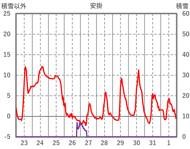 | 日 | 時 | 気温 | 降水 | 風向/風速 | 日照 | 積雪 | 降雪 |