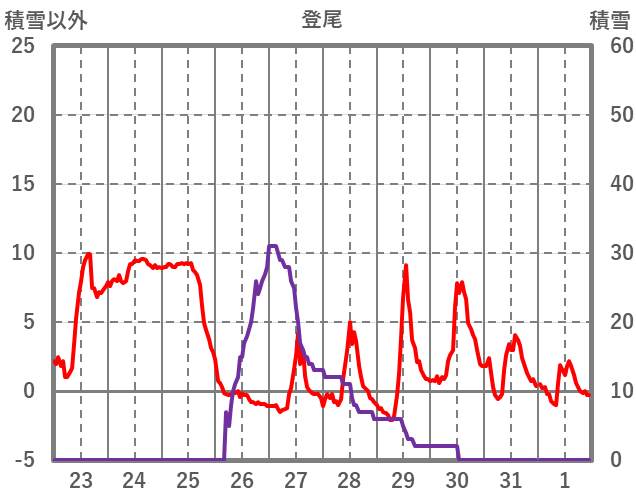 | 日 | 時 | 気温 | 降水 | 風向/風速 | 日照 | 積雪 | 降雪 |