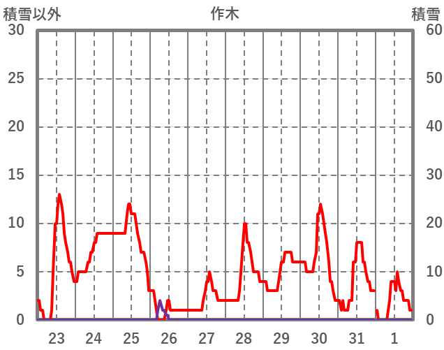 | 日 | 時 | 気温 | 降水 | 風向/風速 | 日照 | 積雪 | 降雪 |
