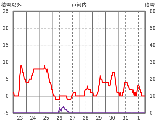 | 日 | 時 | 気温 | 降水 | 風向/風速 | 日照 | 積雪 | 降雪 |