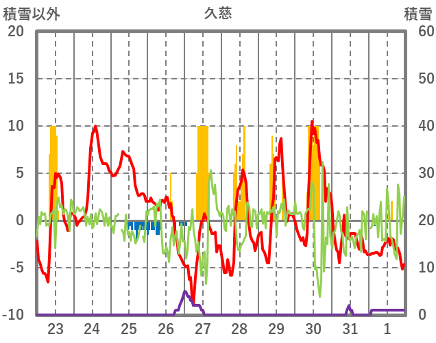 | 日 | 時 | 気温 | 降水 | 風向/風速 | 日照 | 積雪 | 降雪 |
