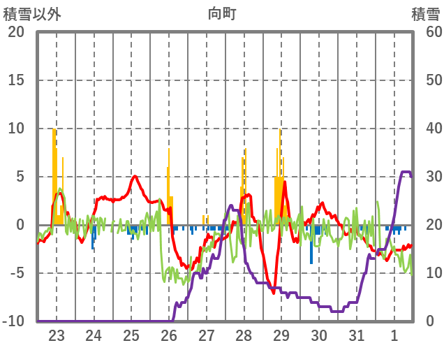 | 日 | 時 | 気温 | 降水 | 風向/風速 | 日照 | 積雪 | 降雪 |