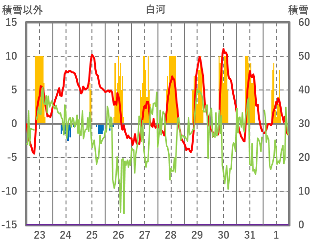| 日 | 時 | 気温 | 降水 | 風向/風速 | 日照 | 積雪 | 降雪 |