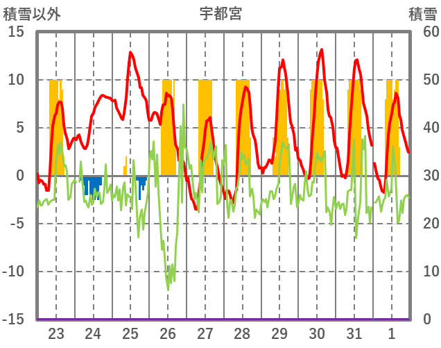 | 日 | 時 | 気温 | 降水 | 風向/風速 | 日照 | 積雪 | 降雪 |