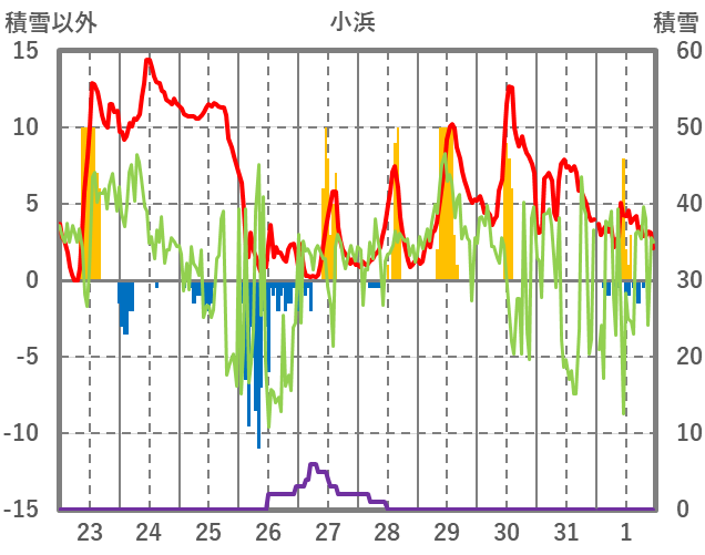 | 日 | 時 | 気温 | 降水 | 風向/風速 | 日照 | 積雪 | 降雪 |