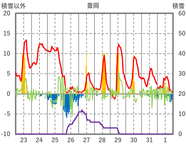 | 日 | 時 | 気温 | 降水 | 風向/風速 | 日照 | 積雪 | 降雪 |