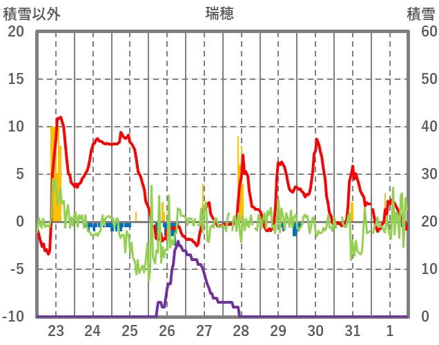 | 日 | 時 | 気温 | 降水 | 風向/風速 | 日照 | 積雪 | 降雪 |
