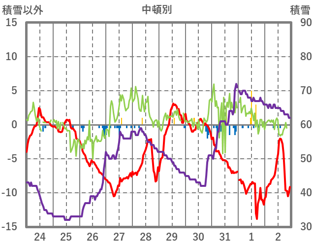 | 日 | 時 | 気温 | 降水 | 風向/風速 | 日照 | 積雪 | 降雪 |