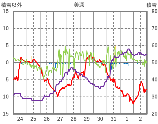 | 日 | 時 | 気温 | 降水 | 風向/風速 | 日照 | 積雪 | 降雪 |