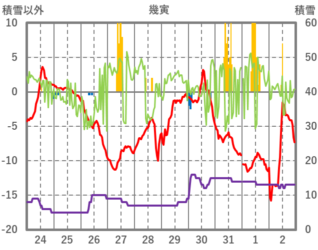 | 日 | 時 | 気温 | 降水 | 風向/風速 | 日照 | 積雪 | 降雪 |