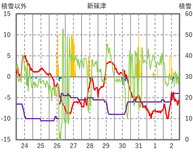 | 日 | 時 | 気温 | 降水 | 風向/風速 | 日照 | 積雪 | 降雪 |
