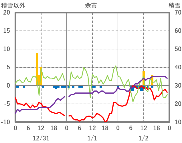 | 日 | 時 | 気温 | 降水 | 風向/風速 | 日照 | 積雪 | 降雪 |