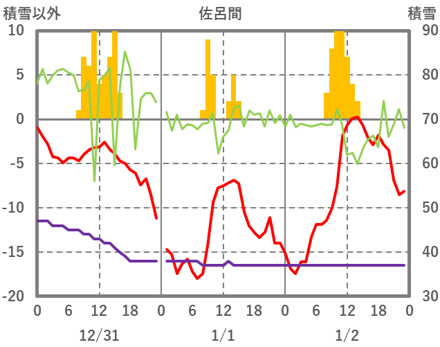 | 日 | 時 | 気温 | 降水 | 風向/風速 | 日照 | 積雪 | 降雪 |