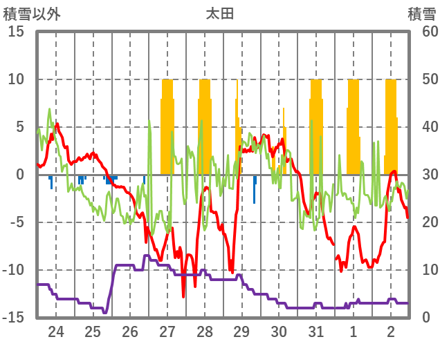 | 日 | 時 | 気温 | 降水 | 風向/風速 | 日照 | 積雪 | 降雪 |
