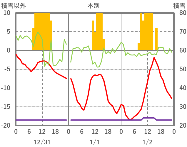 | 日 | 時 | 気温 | 降水 | 風向/風速 | 日照 | 積雪 | 降雪 |