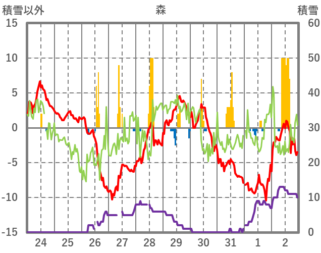 | 日 | 時 | 気温 | 降水 | 風向/風速 | 日照 | 積雪 | 降雪 |