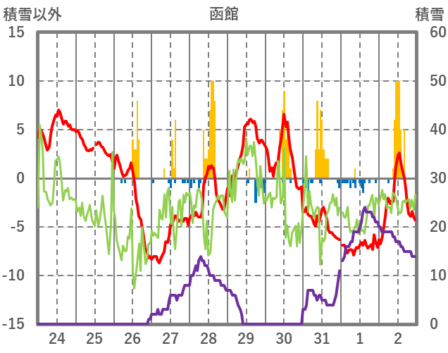 | 日 | 時 | 気温 | 降水 | 風向/風速 | 日照 | 積雪 | 降雪 |