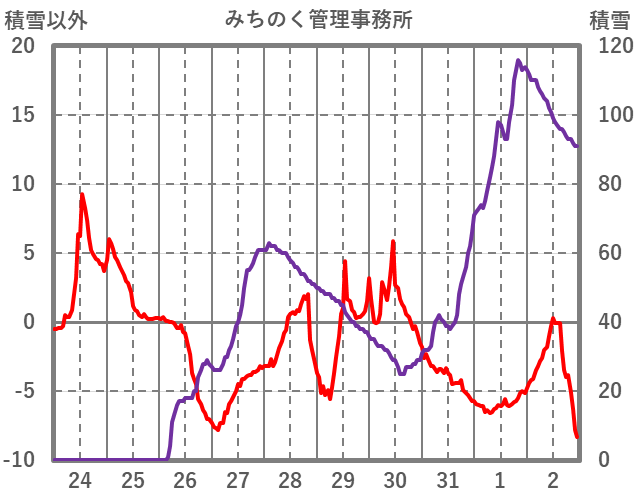 | 日 | 時 | 気温 | 降水 | 風向/風速 | 日照 | 積雪 | 降雪 |