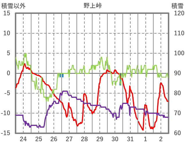 | 日 | 時 | 気温 | 降水 | 風向/風速 | 日照 | 積雪 | 降雪 |