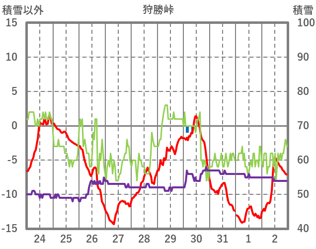 | 日 | 時 | 気温 | 降水 | 風向/風速 | 日照 | 積雪 | 降雪 |