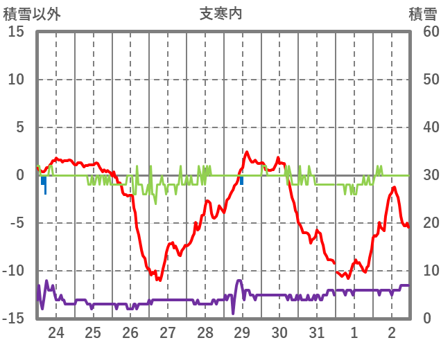 | 日 | 時 | 気温 | 降水 | 風向/風速 | 日照 | 積雪 | 降雪 |