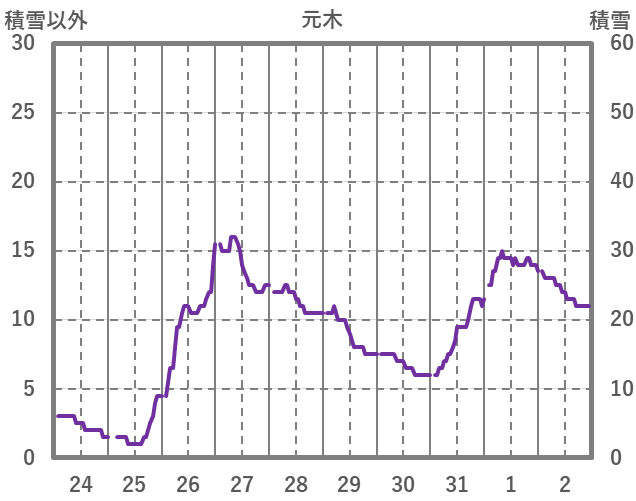 | 日 | 時 | 気温 | 降水 | 風向/風速 | 日照 | 積雪 | 降雪 |