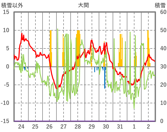 | 日 | 時 | 気温 | 降水 | 風向/風速 | 日照 | 積雪 | 降雪 |