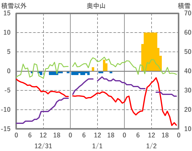| 日 | 時 | 気温 | 降水 | 風向/風速 | 日照 | 積雪 | 降雪 |