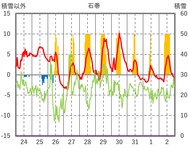 | 日 | 時 | 気温 | 降水 | 風向/風速 | 日照 | 積雪 | 降雪 |