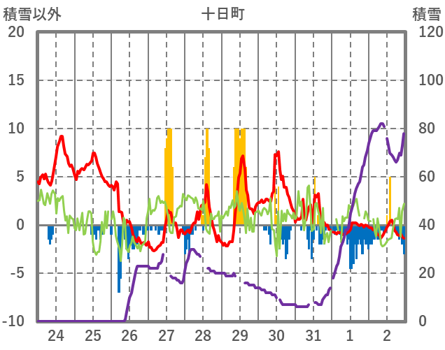 | 日 | 時 | 気温 | 降水 | 風向/風速 | 日照 | 積雪 | 降雪 |