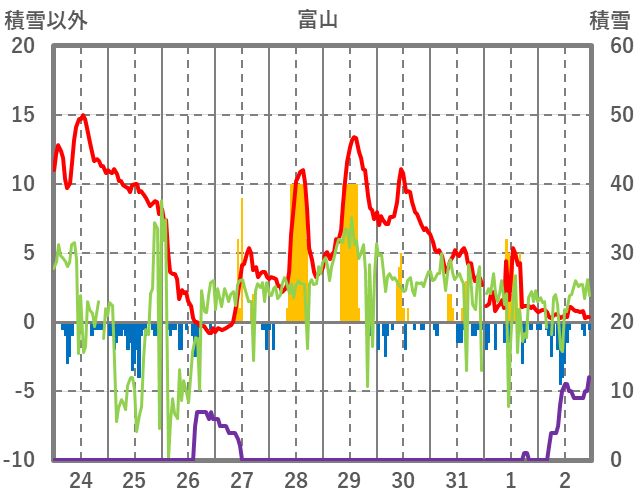 | 日 | 時 | 気温 | 降水 | 風向/風速 | 日照 | 積雪 | 降雪 |